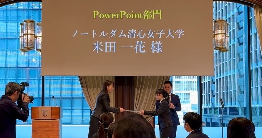 【MOS世界学生大会2025 入賞者表彰式】が東京會館で開催され、本同窓会が大学内で開催している資格取得講座のパソコン講座・パワーポイント部門において、日本語日本文学科3年 米田一花さんが入賞し表彰されました。延べ1万2千人を超えるエントリーの中の60名という大変優秀な成績です。おめでとうございます。