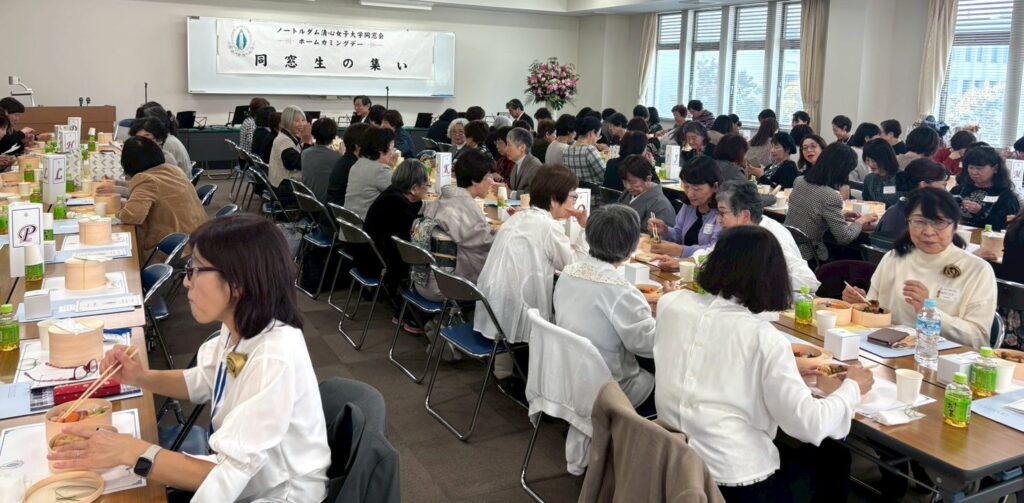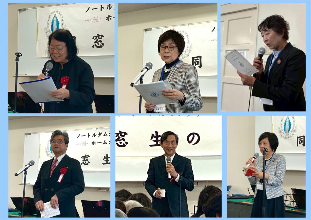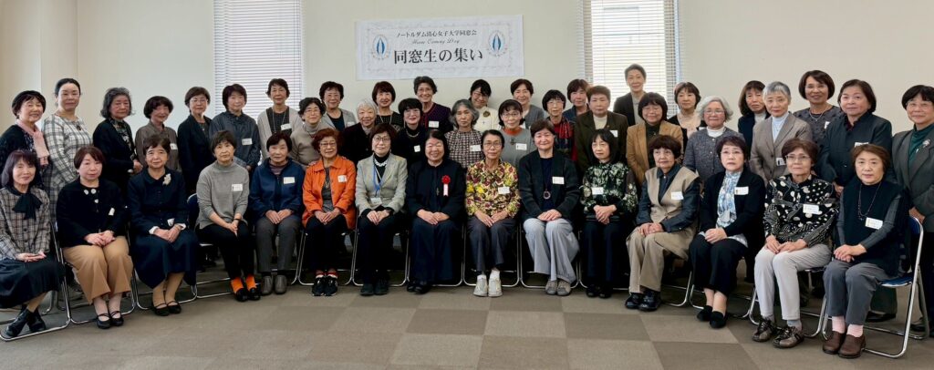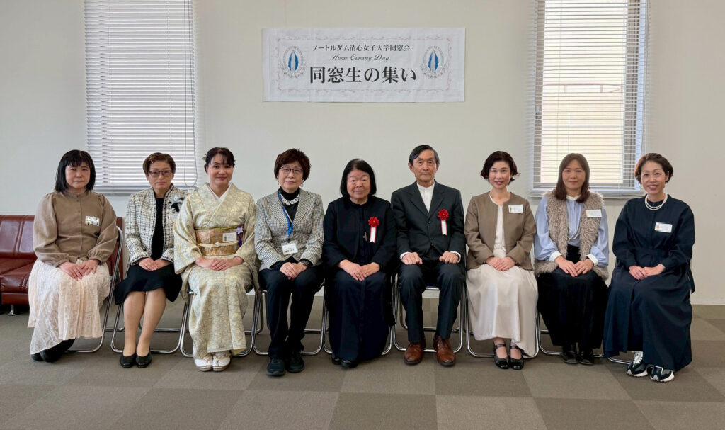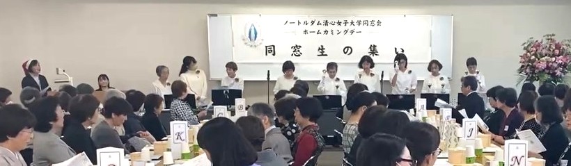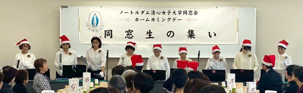7年11月2日大学祭初日、【同窓生の集い】を大学内ヨゼフホール3Fで開催しました。大学から津田学長、小林副学長、上田名誉教授にお越し頂きました。ご卒業50周年の23期と30周年の43期の卒業生は学長と一緒に記念写真。同窓会事業の一環として、本大学の同窓生がボランティアで活動している『エンジェル会』のハンドベル部の演奏を聴きながら、楽しい時間を共有することができました。ありがとうございました。