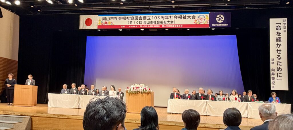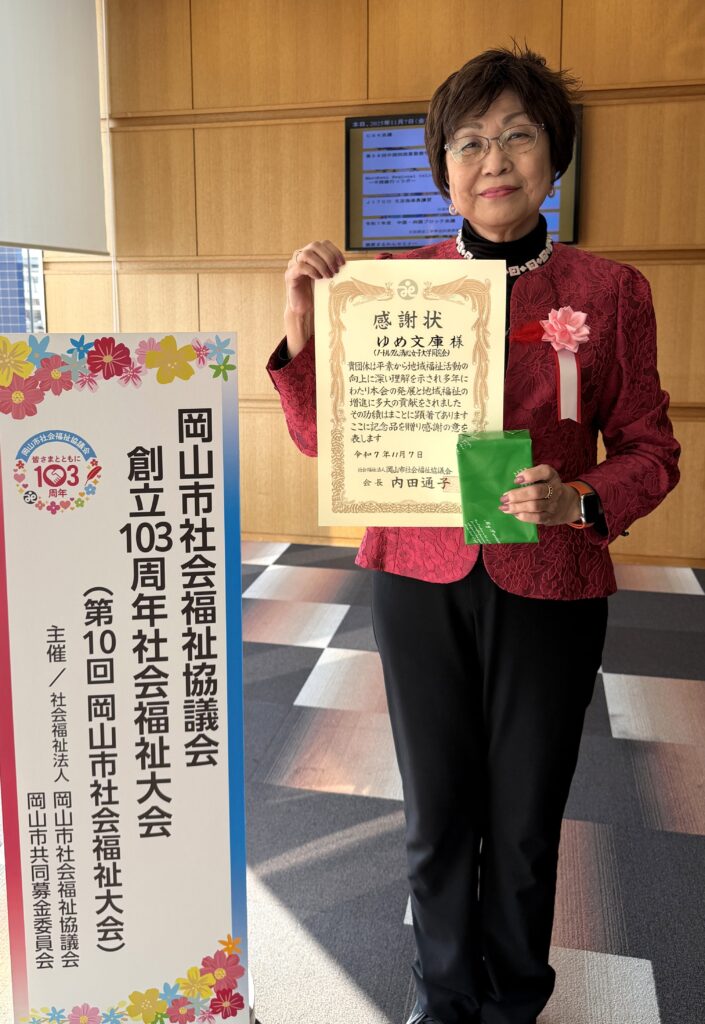 R7年11月7日岡山コンベンションセンターにおいて、岡山市社会福祉協議会創立103周年福祉大会が開催され、本同窓会の『ゆめ文庫』が表彰されました。日頃の地道な活動を認めて頂いて嬉しく思います。おめでとうございます。